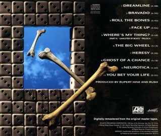 También hay un par de hechos curiosos como es la vuelta a componer una canción instrumental después de mucho tiempo (obligados parece ser por Neil), "Where's My Thing?, Pt. 4: Gangster Of Boats Trilogy" (nos quedamos sin las otras tres partes de la ¿trilogía?) y la primera y última inclusión de un rap en un tema, el de "Roll The Bones". A pesar de que en alguna entrevista han declarado que es la voz de Geddy con mucho efecto añadido yo sigo sin reconocerla. En todo caso un intento de añadir un toque cotemporáneo a su música que es mejor olvidar.